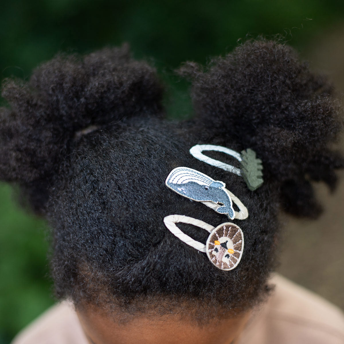 auf einem rosa tisch liegen haarspangen und clips mit wal, bäumen, Fuchs und Bär, daneben eine braune bürste und Zopfgummis