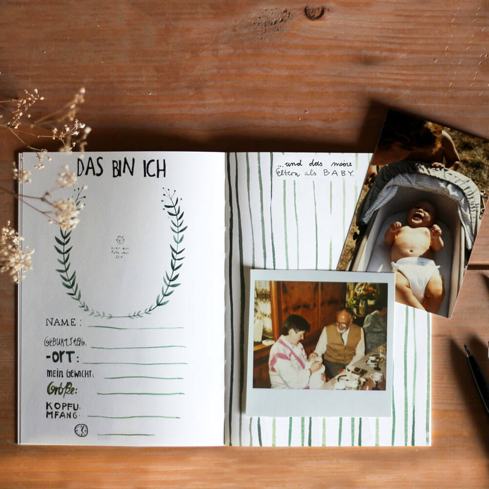 Hurra, das Baby ist da! Das erste Jahr ist für frischgebackene Eltern besonders aufregend und gleichzeitig anstrengend. Ein kleines feines Babybuch mit viel Liebe erstellt kann dabei helfen, mit kleben, malen, ankreuzen und schreiben. Mit den richtigen Fragen lässt es sich ohne langes Nachdenken intuitiv ausfüllen und begleitet euch durch das spannende erste Babyjahr.