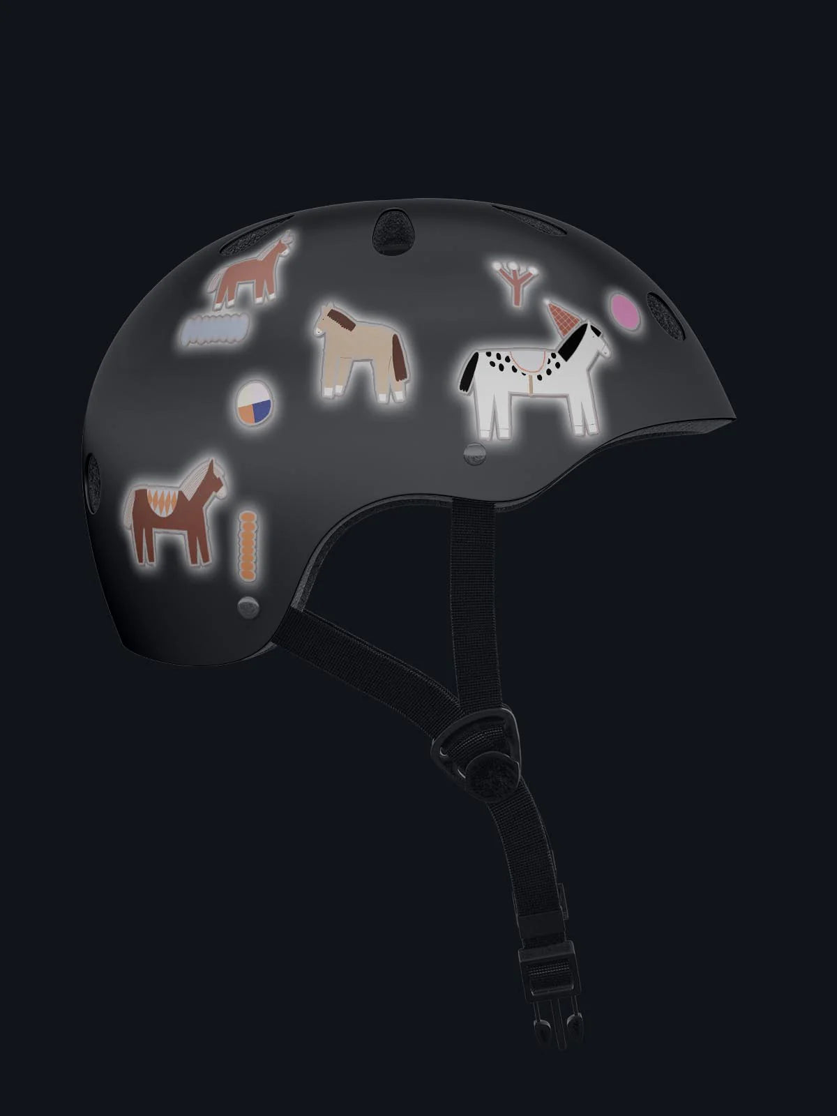 Das kleine Kind will den Helm nicht aufziehen? Das neue Laufrad ist tot öde? Dann haben wir hier die Lösung: Unsere reflektierenden Aufkleber Pferde sehen nicht nur genial aus, sie reflektieren auch das Licht zurück, wenn sie angestrahlt werden.